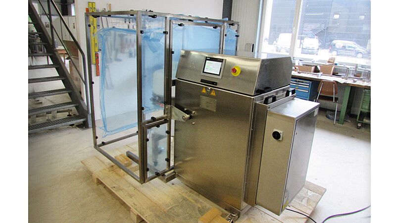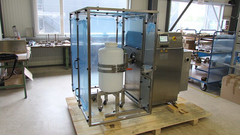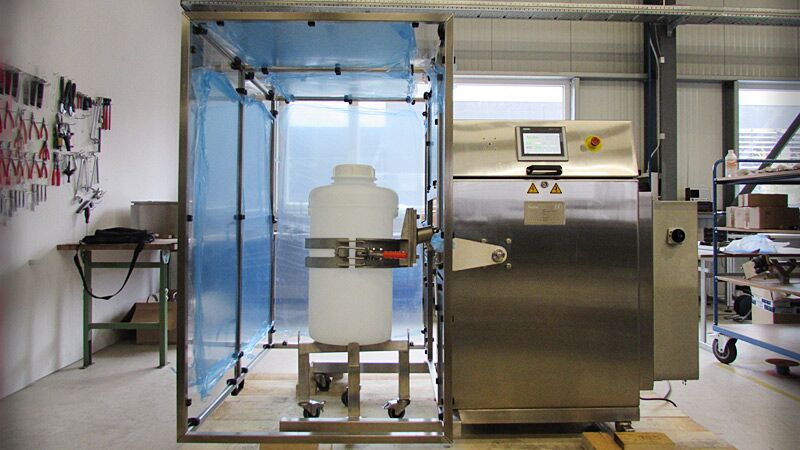 Mélangeur mobile pivotant électriquement type MIXOMAT C-HE 75 HR approprié pour la salle blanche et la zone ATEX 2. A part la fonction de rotation de 360°, ce mélangeur a la possibilité de faire penduler le fût (de 10 à 2h).