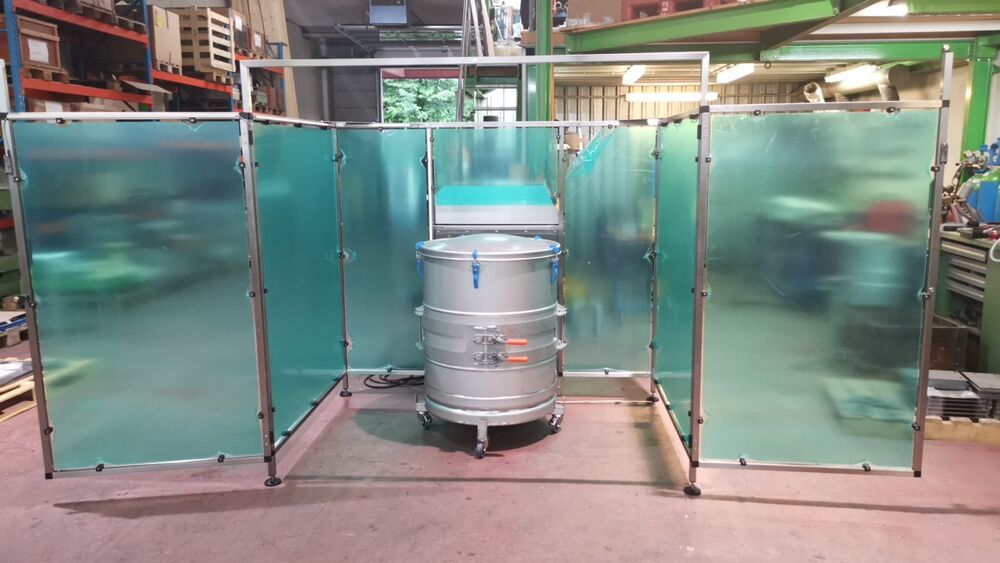 Mélangeur pour fût MIXOMAT C-HE 400 HR avec fonction "chargement de fût" pour et avec fûts de 400 l en acier inox. Le mélangeur est approprié pour les salles blanches et est utilisé dans ce cas pour la homoénigation de produits pharmaceutiques.
