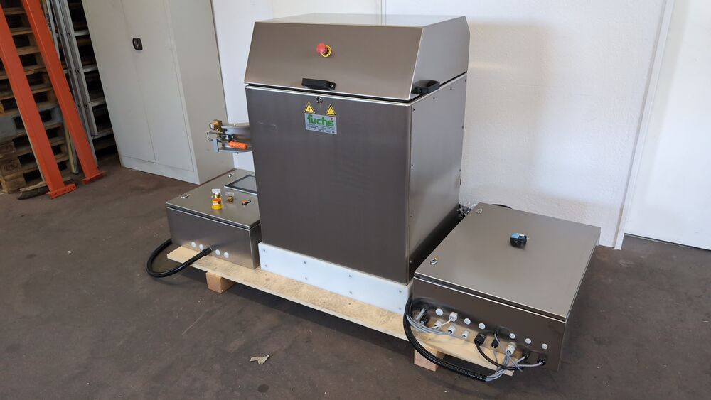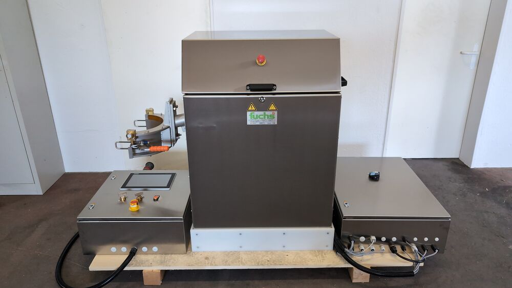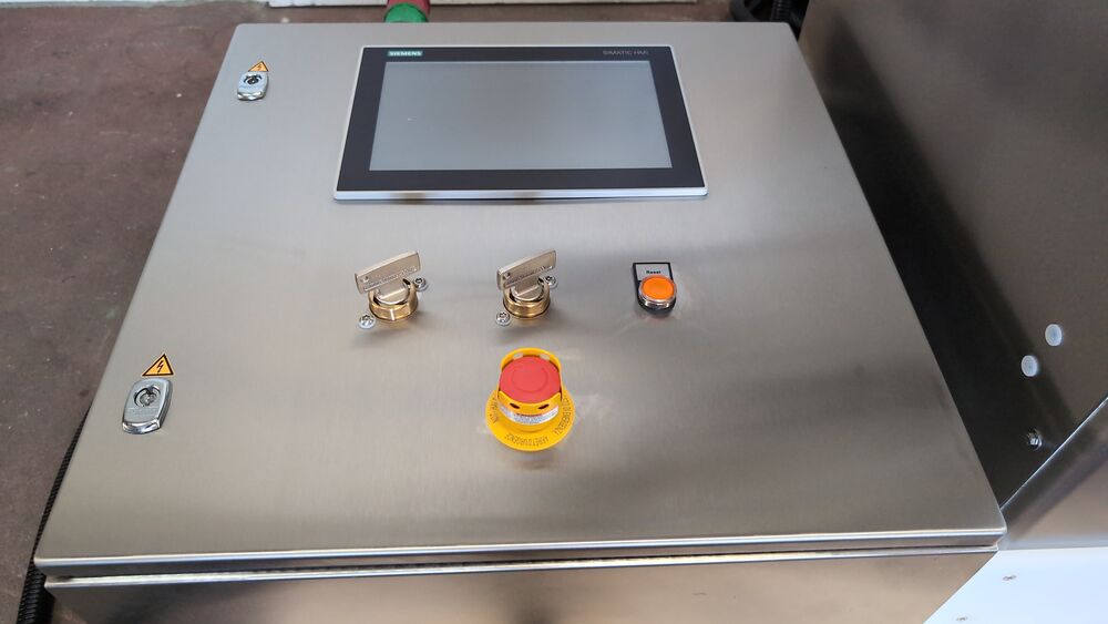 Drum mixer MIXOMAT C-HE2 for dissolving or producing pharmaceutical gels in special containers. With special SIEMENS S7-1500 control unit, special holder with key transfer safety device