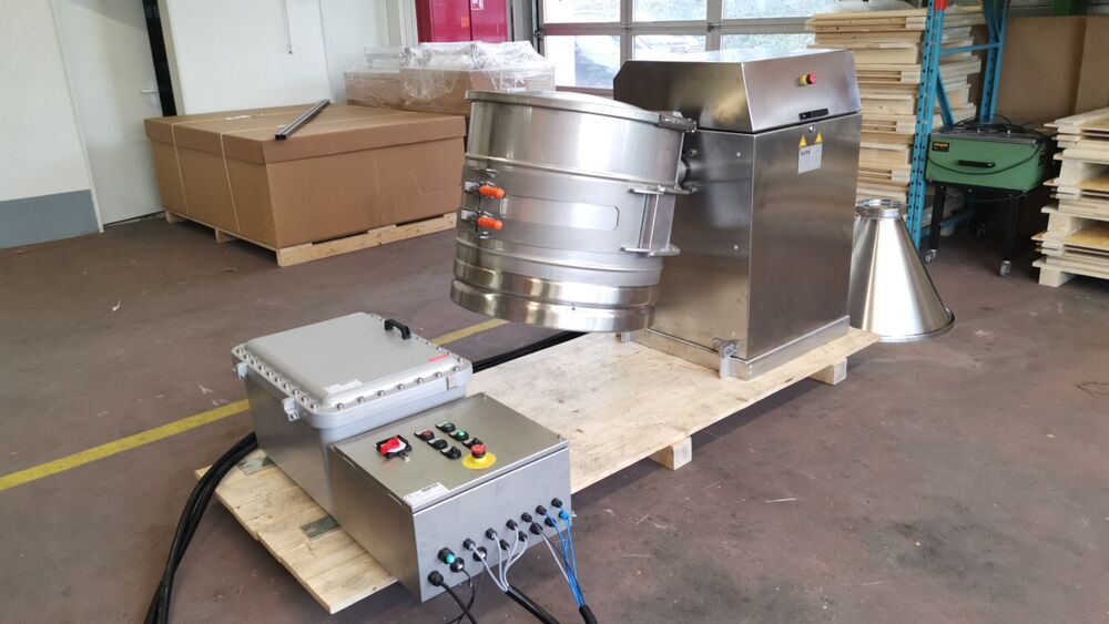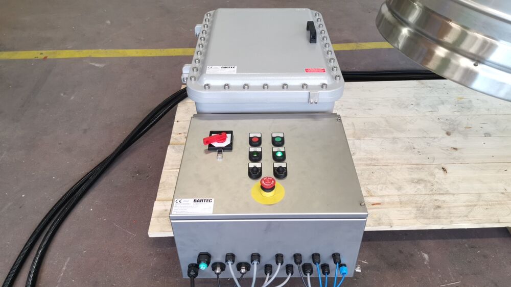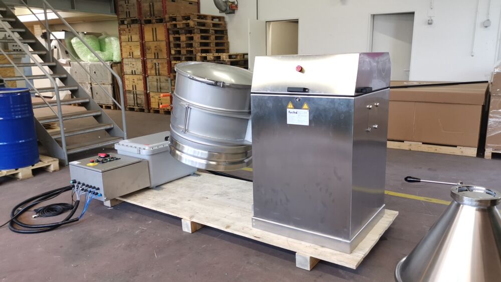Drum tumbler MIXOMAT C-SE 300/- HR for and with 300 l drums from stainless steel. Ex-Execution for Zone 21.