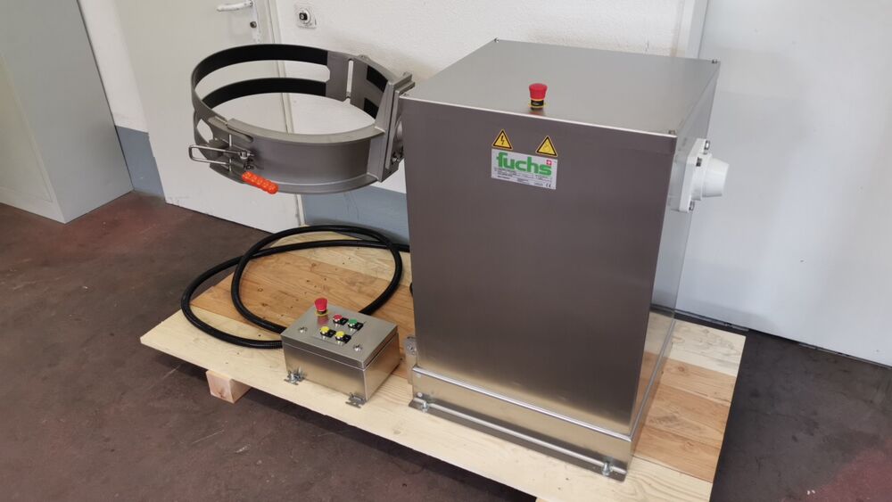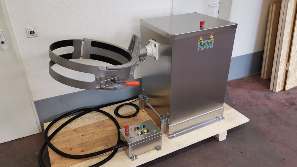 Tilt-to-load Drum mixer MIXOMAT C-SE 220/- HR ecoline adapted to clients 58 gal drums from plastic