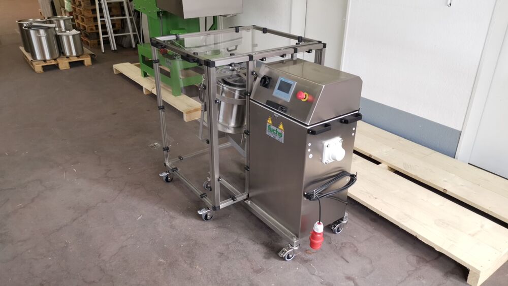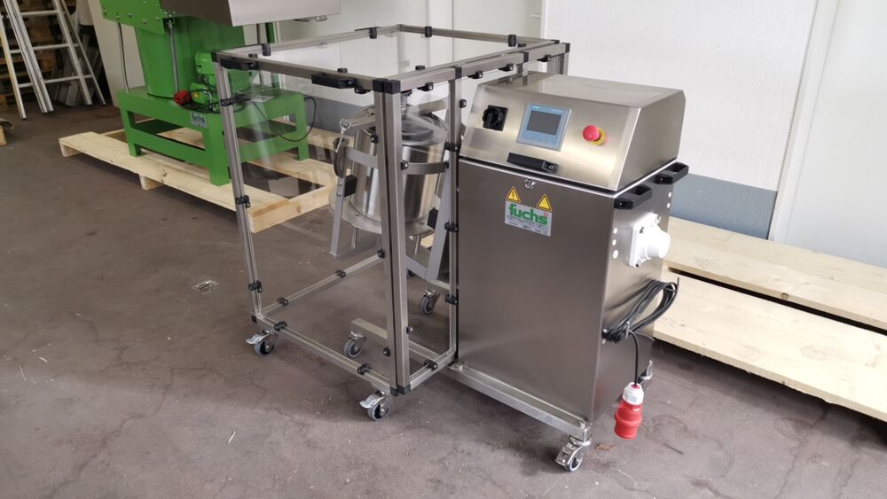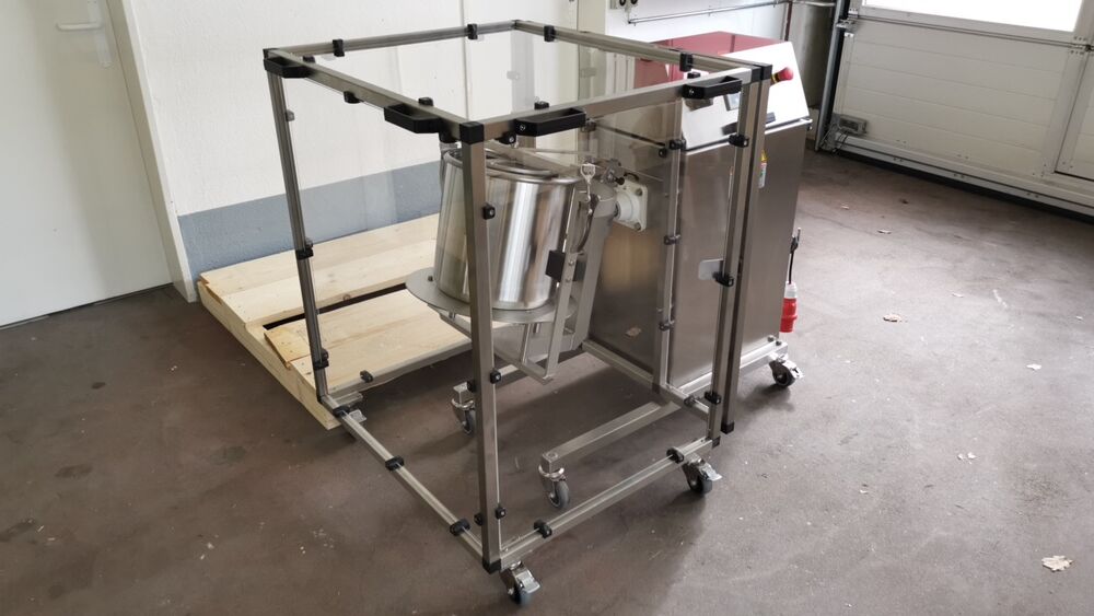 Mobile drum tumbler MIXOMAT B 50(25)/- BV comfortseries for and with 25- and 50 lt drums for homogenizing of pharmaceutical powders. With customized safety device adapted to the tight space conditions.