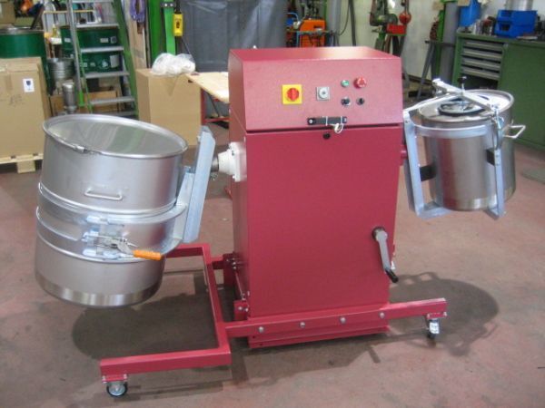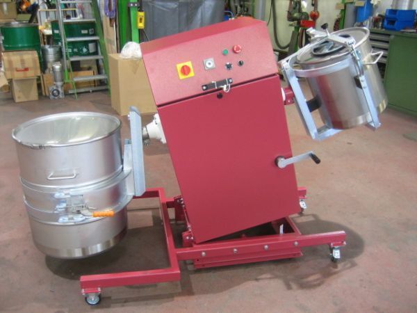 Zweiseitiger mobiler Fassmischer MIXOMAT CM 150/50 HRK/BV für die Mischung von verschiedenen Batchgrössen von Kunststoffpulvern/-Granulaten