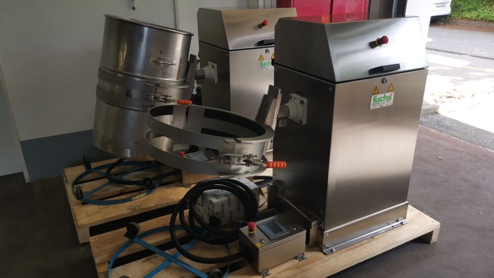 Kippbare Fassmischer MIXOMAT C-SE 200/- HR comfortseries (2 Stück) und MIXOMAT C-SE 100/- HR comfortseries (1 Stück) für die Einfärbung von Kunststoffgranulat in 200, resp. 100 Liter Fässern